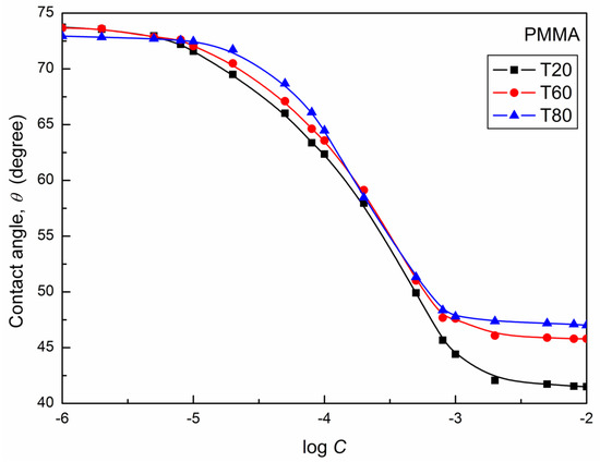 The contact angle isotherms of T20, T60, and T80 aqueous solutions on polymethyl methacrylate (PMMA).