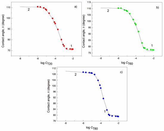 The plot of the measured (points 1) and calculated values from Equation (4) (curve 2) of the contact angle () of the aqueous solutions of (a) T20, (b) T60, and (c) T80 on the PTFE vs. the logarithm of their concentration (log C).