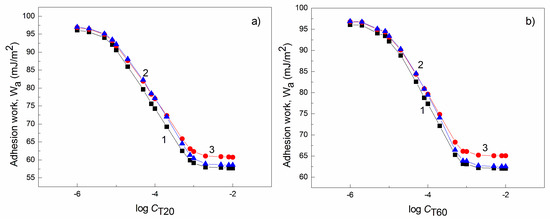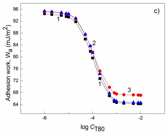 The plot of adhesion work () of the aqueous solutions of (a)T20, (b) T60,and (c) T80 to nylon 6 calculated from Equation (17) (curve 1) and Equation (20) (curves 2 and 3) vs. the logarithm of their concentration (log C). Curve 2 shows calculated based on Equation (7) (surface tension of solid from the contact angle of water minus surface tension of solid from the contact angle of solution), and curve 3 shows the calculation for .
