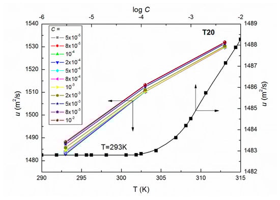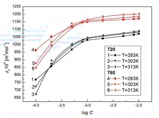 As follows from Figure 5, at C higher than 10−3 M the calculated values of (Equation (4)) for T20 are higher than those for T60 which means that at T20 solutions more conversion to bulk water of the structured water molecules is observed, obtaining lower compressibilities and higher values of for a given T.