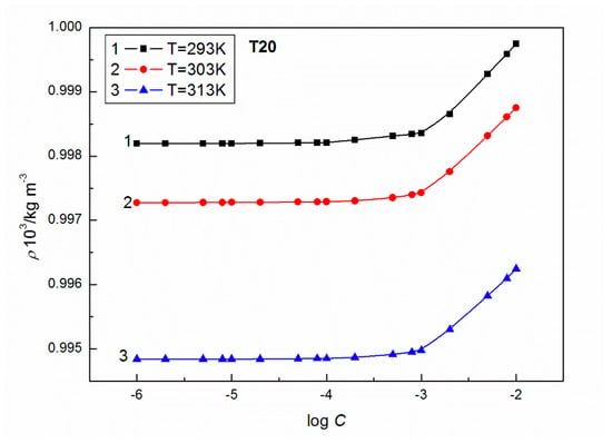 A plot of the values of density of aqueous solutions of T20 at C from 10−6 to 10−2 M vs. log C at T = 293 K (curve 1), 303 K (curve 2) and 313 K (curve 3).