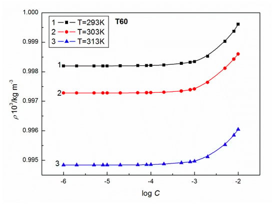 A plot of the values of density of aqueous solutions of T60 at C from 10−6 to 10−2 M vs. log C at C from 10−6 to 10−2 M vs. log C at T = 293 K (curve 1), 303 K (curve 2) and 313 K (curve 3).
