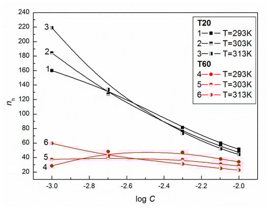 A plot of the values of hydration numbers of aqueous solutions of T20 (curves 1–3) and T60 (curves 4–6) vs. log C at T = 293, 303 and 313 K.