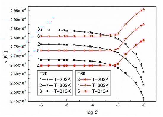 This idea is also confirmed by the calculated values of and (Equations (5) and (6)), which suggest significant structural changes in the studied surfactant micelles with the increasing temperature and/or changes in the intermolecular interactions occurring between the surfactants and water. The mentioned interactions can be described, among others, by the values of also known as the coefficient of thermal expansion which is a measure of how the volume changes with the temperature, as presented in Figure 6. From this Figure it can be observed that at a given T for T20 at a concentration higher than 10−4 M, the values of decrease significantly in contrast to those for T60, for which at C > 10−3 M the values for the volume expansivity increase. Also, from the comparison of the values of T20 and T60 at T = 293 K it appears that at C < 10−3 M these values are higher for T20, but at C > 10−3 M the situation is quite opposite. This suggests that at a given temperature and high surfactant concentration, the water around T60 is loosely bound because of larger values of volume expansivity which is in accordance with the values (Table 1 and Table 2). A larger value of at a given concentration also indicates greater sensitivity in the volume change due to the temperature change. The results in Table S1 (Supplementary Materials) show that the values of fractional free volume (), which is expressed in terms of the repulsive exponent of intermolecular potential for both surfactants and a given C, show an increase with T and indicate that the mobility of surfactant molecules enhances the disordered state of the liquid (surfactant + water) due to irregular packing of the molecules [34]. At the same time the parameters , , , and show a decrease with the increasing temperature. Indeed, the changes in these parameters at C > 10−3 M are quite the opposite for T20 and T60 (Table S1).