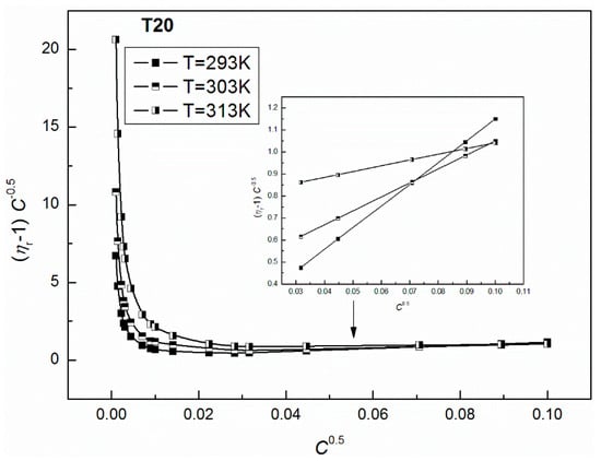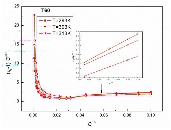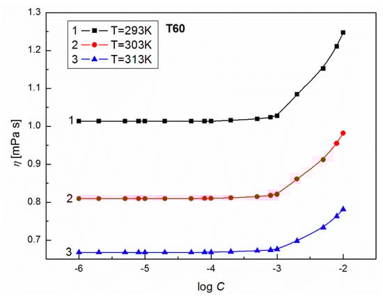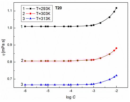 To show the influence of surfactants’ concentration on the structure of the solution, the values of for T20 and T60 were calculated from Equation (8) and are presented in Figure 7. From this figure, it can be seen that at high surfactant concentration, the values of for T20 and T60 increase with T. For T60, when C is smaller than 10−3 M, a drop in apparent molar volume with T is observed. This probably indicates that more dimmers or trimmers are formed and their density is higher. The formation of such supramolecular structures should induce significant changes in the dynamic viscosity of solutions. As follows from Figure 8 and Figure 9, the values of dynamic viscosity () of aqueous solutions of T20 and T60 are highly sensitive to temperature changes. Also, the values of T60 at a given T are higher than those for T20 since depends on dispersion forces. This is in contrast to the and changes and might be connected with the larger sized and structured T60 micelles which have higher friction on the capillary, but lower than T20. As follows from Figure 10, the calculated values of for T20 are much larger than those for T60, and for both surfactants there is a significant increase at C > 10−3 M, which is in contrast to the already studied Tween 80 [39]. The values of the studied surfactants are between 15.9 and 18.2 kJ/mol and this confirms the existence of spherocolloids in the solution at the studied concentrations. On the other hand, as non-electrolytes with the hydrophilic 3-hydroxyl group, they have a high affinity for water and are involved in intramolecular hydrogen bonding with water. The viscosity coefficient is a good tool for providing information about salvation of the solute (surfactant) in the solution and the effect on the structure of the solvent (water) in the vicinity of solute molecules. This can be obtained from fitting the experimental viscosity data with the Jones-Dole equation from the plots of against where is the relative viscosity and C is the molar concentration [40,41]. The viscosity coefficient is a measure of the size and shape of the solute molecules as well as the structural effects induced by solute-solvent interactions.