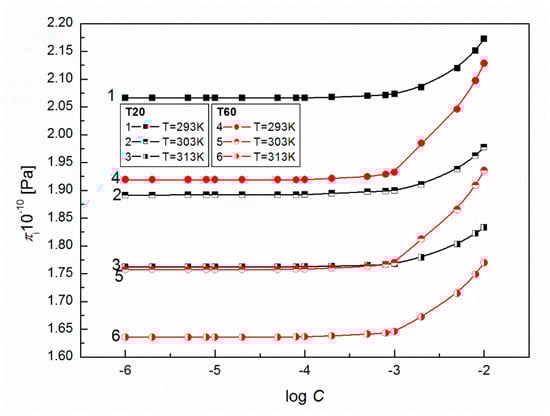 A plot of the values of internal pressure of aqueous solutions of T20 (curves 1–3) and T60 (curves 4–6) vs. log C at T = 293, 303 and 313 K.