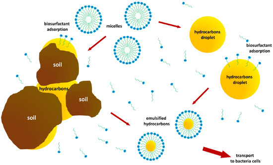 The main process taking place in aqueous environment into which biosurfactants have been introduced is the formation of emulsions as well as desorption of hydrophobic compounds (Figure 2) [24]. Biosurfactants allow the scattering of substances slightly or virtually immiscible with aqueous phase in aqueous solution [25,26]. These bioactive compounds reduce interfacial tension between immiscible liquids and increase the solubility of hydrocarbons [27]. As a result, the interfacial mass exchange in the surface multiplies, which translates into an increase in the permeation of organic compound molecules to the solution, increasing the availability of the biodegradable compounds to cells [22,28]. At the same time, the reduction of interfacial tension leads to increased penetration of porous materials (e.g., soil and bottom sediments) through the aqueous phase [29,30]. Surfactants in the amounts above the critical micellar concentration (CMC) can form micelles in aqueous solution. This parameter is usually used to evaluate the efficiency of surfactants. In aqueous phase, when their concentration is above CMC, surfactant micelles have a hydrophobic core, and therefore they can accumulate hydrophobic hydrocarbons. As a result the aqueous hydrocarbons’ solubility is increased [31]. It was also observed that in biological systems the critical micellar concentration could be even five times higher [32]. Kaczorek et al. [33] have shown that in a biological system (with bacteria cells) the CMC of rhamnolipids was three times higher than in pure water. It should be also noticed that the formation of micelles with the surfactant and the closure of impurities in them can bring ambivalent results. On the one hand, an easier transport of pollutant particles to microbial cells in an aqueous solution is observed [34], which contributes to an increase in bioavailability [35,36]. It is also possible that the hydrocarbons can be taken directly by microbial cells from micelles [37]. On the other hand, long-term closure of the biodegradable substance in the micelles may occur. Then, its penetration into the cells is significantly reduced, especially when the micelles combine and their mass increases, which is associated with an increase in the sedimentation rate [38]. In addition, the surfactant adsorbs at the interface to inhibit cell access to the hydrophobic substrate [39]. Another unfavorable phenomenon is the formation of foam on the surface of the system, e.g., a water reservoir in which biodegradation takes place. Its presence can significantly reduce gas exchange between the water phase and the surrounding air. Therefore, the amount of oxygen entering the solution and the carbon monoxide (IV) released are reduced [40,41].