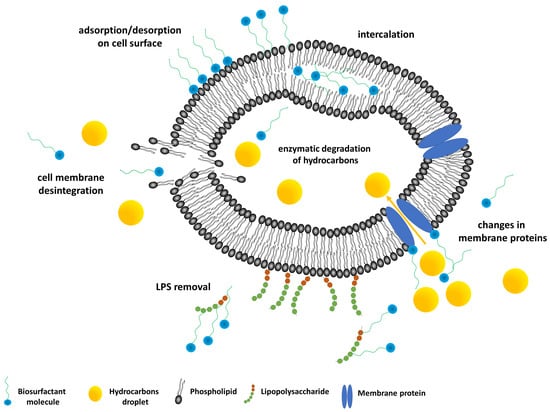 The use of biosurfactants in supporting the biodegradation of hydrophobic hydrocarbon pollutants raises the question about the impact of these natural surfactants on the cells of microorganisms involved in bioremediation (Figure 3). The issue has become the focus of interest for many researchers, also in recent years, hence the need to summarize research devoted to this issue.