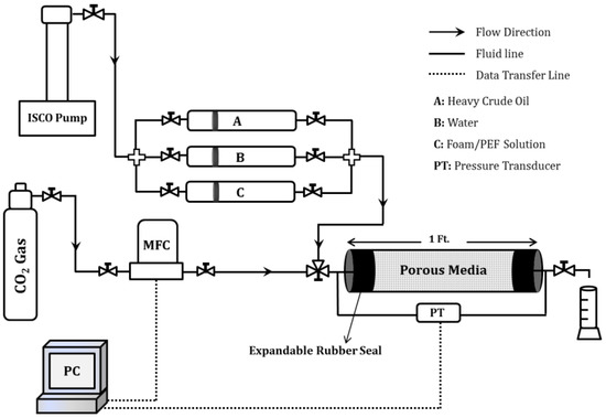 To analyze the dynamic performance of foam and PEF in porous media, a linear visual sand pack was used (1-ft in length with an inner diameter of 1-inch). The visual cell was packed with glass beads (40–70 meshes), and a special expandable rubber was used to seal both ends. A metal screen (80 meshes) was used to avoid sand production. After vacuuming the sand pack (at least 3 h), water saturation and permeability measurements were conducted. The measured porosity and permeability of the sand pack were 37 ± 0.5% and 38 ± 0.5 Darcy, respectively. The porous medium was then saturated with heavy crude oil (1320 cp) until no water was produced. A syringe pump (ISCO, Model 500D) and a pressure transducer (OMEGADYNE, Model PX409) were used for liquid injection and pressure record, respectively. A schematic of the dynamic experiments set up is shown in Figure 1.