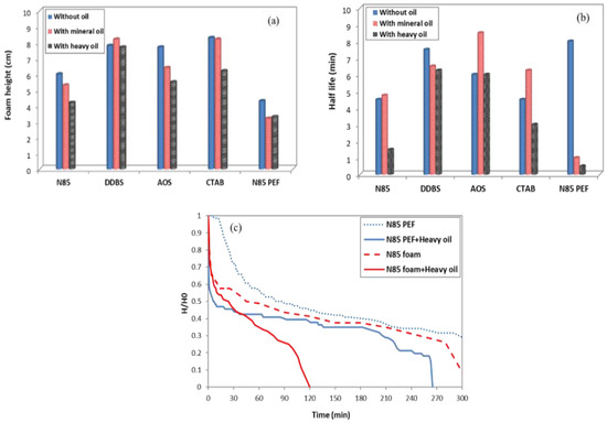 Oils generally destabilize and can also stabilize a foam system [14]. In this study, the effect of heavy crude oil and mineral oil was examined on foam stability. The results are shown in Figure 3. The presence of heavy oil decreased the foamability and stability of foams and PEFs generated with all types of surfactants, especially N85. By contrast, the presence of mineral oil stabilized or destabilized the studied foams depending on the surfactant type. In terms of foamability, the addition of mineral oil had no drastic effect on foamability and foam stability of foams compared to that of heavy oil. Considering foam stability, in some cases, the addition of mineral oil resulted in an increase in the foam stability (N85, AOS, and CTAB foams). The addition of polymer did not improve the stability of N85 foam in the presence of oils. However, the decay profile (Figure 3c) showed that N85 foam completely collapsed after 2 h, whereas this value was more than 4 h for N85 PEF.