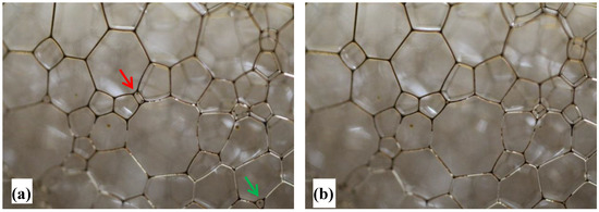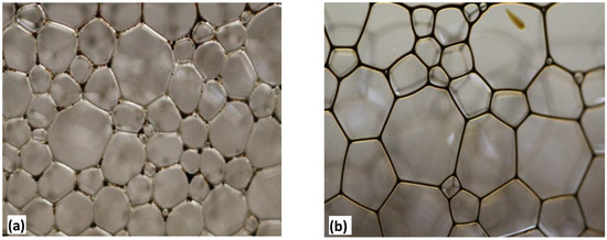 Stage I: During Stage I, the main process affecting the foam decay profile was liquid drainage. It should be mentioned that some minor bubble coarsening may have occurred during this stage, but the dominant phenomenon was the liquid drainage. Images of the foam bubble texture at the foam top and liquid–foam interface during this stage are shown in Figure 4.