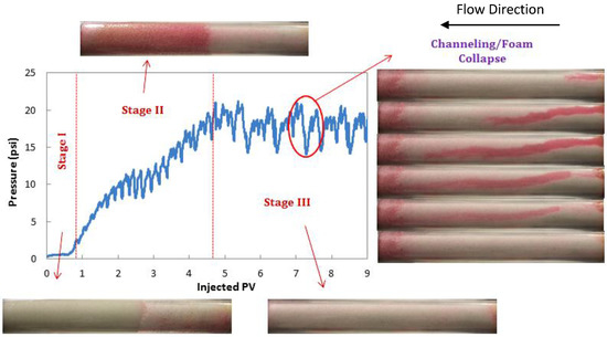 The pressure profile during SAG injection in water-saturated sand pack can be divided into three distinct stages, as shown in Figure 10. The images of sand pack at each of the stages are also shown. Because the porous media was not presaturated with surfactant and the injection method was alternative, a relatively long time was required for the foam generation. During this time, surfactant and gas acted as separate slugs (two phases) and the foam was not generated. This was characteristic of Stage I. It can be said that the shorter length of Stage I demonstrated the better performance of the solution in terms of generating the foam faster within the porous media. The onset of foam generation coincided with the beginning of Stage II. An abrupt increase in pressure profile during SAG injection represented the generation of foam [34]. During Stage II, the foam was generated and propagated through porous media and resulted in an increase in the pressure drop. The slope of this stage shows how fast the foam can propagate within the porous media, and it can be used as criteria for comparing the performance of the foaming solutions. At the end of Stage II, foam occupied the whole length of sand pack and the pressure drop remained constant; this was the onset of Stage III. This stage can be termed as steady state foam injection. Pressure drop remained constant during Stage III; however, there might have been some fluctuations in pressure drop. Small pressure fluctuations during this stage demonstrated the temporary channeling or collapse of foam, which would be recovered at the end of same slug or the next successive slug injection. The sand pack images (Figure 10) show the foam-channeling phenomenon during stage III. Less channeling with lower pressure drop fluctuation can be used as criteria to compare the dynamic stability of the generated foam within the porous media.
