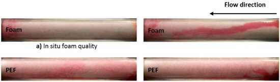 (a) In situ foam quality and (b) foam dynamic stability of N85 foaming solution in a dynamic condition; PEF showed lower foam quality but higher dynamic stability (less channeling) than that of foam.