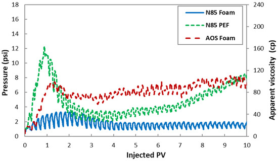 Figure 13 shows the pressure and apparent viscosity profiles of foam and PEF propagation in heavy-oil-saturated sand pack for different foaming solutions. The first peak in pressure profile was due to the development of the oil bank through porous media and then its production. The corresponding oil cut was at its highest value at this point. Heins et al. (2014) also made similar observations [38]. At the same experimental condition of permeability, core dimension, flow rate, and viscosities of oil and foaming solution, the observed pressure drop could have a direct relationship with the quality of the generated foam or PEF at this stage. Higher pressure drop represents higher apparent viscosity of foam or PEF within porous media. At the initial stage of foam injection, bubbles first entered larger pore channels with lower entrance capillary pressure and the foam texture was coarse. Then, the local pressure gradient increased because of the increased foam flow resistance, and therefore foam bubbles entered relatively small pore channels [39]. The foam flow repeated this process until the steady state was reached. The pressure increased, and the foam texture became finer as foam entered smaller pore channels because the porous media shaped the foam [40]. According to Figure 13, the strong foam was generated and started to propagate in the case of N85 PEF. This can be explained by high pressure at the early time of injection. However, this was not the case for N85 foam injection.