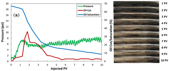 Visual observation of the sand pack (Figure 14) showed that oil appeared to move with the passage of gas bubbles, whereas it had very little movement during liquid injection. These observations are in accordance with Li et al. (2010) [34].