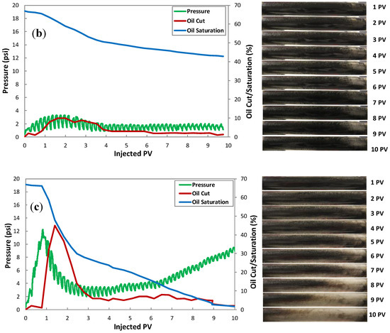 For detailed analysis, foam/PEF pressure drop, change of residual oil saturation, oil cut, and images of porous media at different injected pore volume are plotted in Figure 14.