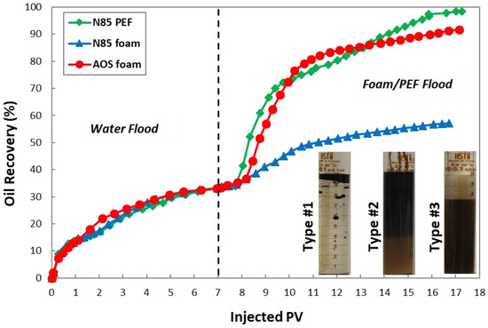 Total heavy oil recovery profiles during water and foam/PEF flooding with different foaming solutions. The images show the foam/PEF flooding effluent samples; Type #1: bulk oil and water, Type #2: oil-in-water emulsion and free gas, and Type #3: oil-in-water emulsion and foam.
