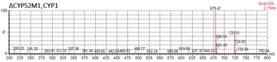The native cyp52m1 gene of S. bombicola was replaced by the cyp1 gene of U. maydis in S. bombicola as described in the Materials and Methods section. To investigate the activity of CYP1 in S. bombicola, an initial growth trial was performed on palmitic acid (5 g/L). A strain not capable of synthesizing sophorolipids (a cyp52m1 knock-out, see Table 2) was used as the control. The LC–MS spectrum of samples for the new strain in contrast to the control showed a signal for sophorolipids with molecular mass 679 m/z (di-acetylated acidic sophorolipids with a C16:0 fatty acid chain; Figure 1). Its formic acid adduct can also be seen (723 m/z). This shows that replacement of CYP52M1 by another P450 results in sophorolipid production, with a different alkyl chain in comparison to the wild type. It has to be noted that the amount of produced sophorolipids was very low. After eight days of production, the signal was barely above the detection limit of the LC–MS.