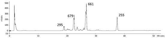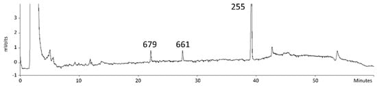 HPLC in conjunction with an evaporative light scattering detector (ELSD) chromatogram of the sophorolipid production of the CYP1BMR strain grown on palmitic acid after eight days in the stationary phase. Products detected are di-acetylated acidic C16:0 sophorolipids (679 m/z, 22.2 min), di-acetylated lactonic C16:0 sophorolipids (661 m/z, 27.5 min), and the substrate palmitic acid (255 m/z, 39.2 min).