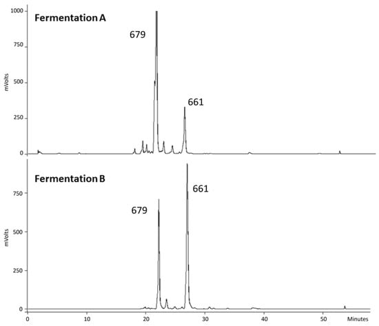 Difference in the ratio of the sophorolipid products in the two 30-L fermentations: acidic (22.4 min, 679 m/z) and lactonic (26.6 min, 661 m/z) di-acetylated C16:0 sophorolipids.