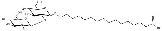 The chemical formula C28H52O13 was confirmed by the integration of the 1H and 13C NMR spectra (Figure S6). When both subterminal and terminal hydroxylation occur, a doublet around 1.12 ppm is detected in the 1H spectrum [28]. Considering that there is no signal that accounts for the presence of a methyl group, here, only terminal hydroxylation occurred. NMR spectral analysis could also validate the presence of two carbohydrates (two anomeric protons) and a terminal carboxyl group (174.66 ppm in the 13C spectrum). The NMR data support the LC–MS identification, and confirm the molecular structure of the “novel” sophorolipids with a terminally bound palmitic acid tail, as shown in Figure 8.