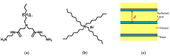 In a previous study [20], we demonstrated that an emulsion comprising a dual-surfactant system of a long-chain amidoamine derivative (C18AA) (Figure 1a) and tetraoctylammonium bromide (TOAB) (Figure 1b) shows novel thermo-responsive iridescent phenomenon due to phase inversion on heating from an oil/water emulsion to a water/oil emulsion, passing through a lamellar phase that develops an iridescent color. The lamellar phase has a periodic lamellar structure composed of water, toluene, and surfactant layers of C18AA and TOAB (Figure 1c). The coloration is produced by the interference of light at the periodic layered structure. Furthermore, the coloring temperature and the color of the emulsion are independently controllable by adjusting the concentrations of C18AA and TOAB, respectively. The emulsions developed an iridescent color in a specific narrow temperature range (~3 °C), which indicates that the emulsion exhibits thermo-responsive coloring phenomenon; however, the color is not switchable by application of an external stimulus.