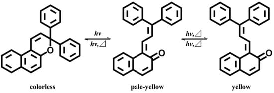 The color of photochromic 3,3-diphenyl-3H-naphtho[2,1-b]pyran (Pyran) (Figure 2) changes from white to yellow upon irradiation with UV light because of photoisomerization [21]. Furthermore, as the isomers of Pyran are soluble in toluene, but not in water, we expect that Pyran molecules present in the bulk toluene phase of C18AA + TOAB emulsions are not affected by UV irradiation. This enables us to impart photo-responsive function to the C18AA + TOAB iridescent emulsion without affecting their thermo-responsive iridescent behavior. In this study, we demonstrate that the addition of Pyran in C18AA + TOAB emulsion bestows dual stimuli-responsive (i.e., thermo- and photo-responsive) functions which help in controlling the color of the emulsion in response to both heat and light. Furthermore, we show that the brightness of the iridescent color can be improved by adding NaOH; the original C18AA + TOAB iridescent emulsion at room temperature has poor brightness, which reduces the performance of the dual stimuli-responsive iridescent emulsion.