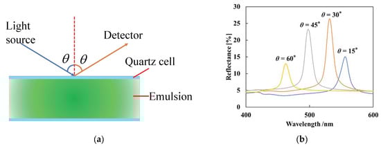 (a) Schematic illustration of the experimental setup for direct UV–Vis measurements. (b) Direct UV–Vis reflection spectra of the iridescent emulsion at various incident and detection angles.