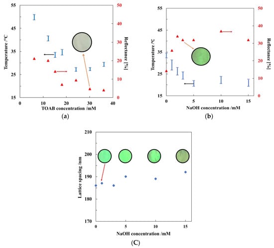 Effects of (a) TOAB and (b) NaOH concentration on the coloring temperature range and the reflectance of the interference peak in the UV–Vis reflection spectra of the iridescent emulsion. The incidence and the detection angle of light was θ = 15° from the normal. (c) Lattice spacing and photographs of the C18AA + TOAB emulsions vs. [NaOH], at [C18AA] = 30.7 mM and [TOAB] = 15 mM.