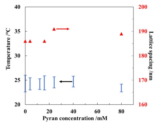 Effect of concentration of Pyran on the coloring temperature range and lattice spacing of the C18AA + TOAB emulsions at [C18AA] = 30.7 mM, [TOAB] = 15 mM, and [NaOH] = 3 mM.