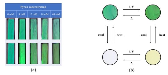 (a) Photographs of the original (upper) and the UV irradiated (bottom) emulsions at various Pyran concentrations; [C18AA] = 30.7 mM, [TOAB] = 15 mM, and [NaOH] = 3 mM. (b) Color variation of C18AA + TOAB emulsion in response to UV light and heat; [C18AA] = 30.7 mM, [TOAB] = 15 mM, [NaOH] = 3 mM, and [Pyran] = 16 mM.