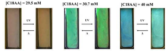 Other color changes induced by irradiation of UV light, instead of bluish green to green, are also possible, because the interference color of the iridescent emulsions is controllable by varying the concentration of C18AA [20]. For example, color changes from pink to pale orange and blue to light blue can be accomplished using 29.5 mM and 40 mM C18AA, respectively (Figure 7). Thus, tuning the starting emulsion color enables broadening of the color range of iridescent emulsions easily. However, in the present system, the color variation is limited because the additional color is fixed by the yellow color of Pyran, whereas the original interference color is controllable by the concentration of C18AA. To overcome this limitation and to realize the desired color variation, i.e., changes from one desired color to another desired color, we have to extend the range of the additional color. Such extension is quite possible by introducing water- or toluene-soluble photo-responsive coloring materials, such as photochromic compounds, fluorescent compounds, and quantum dots, into the present iridescent emulsion system.
