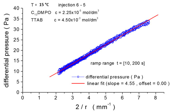 Fitting of differential pressure vs. inverse radius, r, for injection 6-5 at T = 15 °C for a growing drop experiment, with filtered reference pressure and adjusted calibration parameters (linear fit, slope = 4.55 mNm−1, offset = 0.00 Pa).