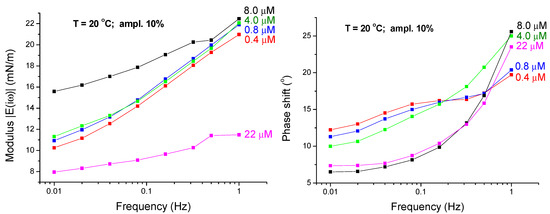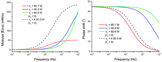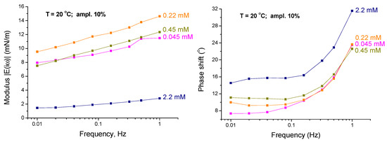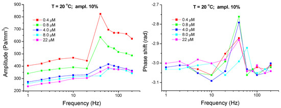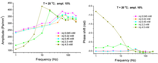 For frequencies below 10 Hz the contribution of hydrodynamic effects is very small and the level of the plateau left from the amplitude maximum is determined mainly by the two last terms in Equation (19), i.e., by the properties of the drop interface [28,46]. The equilibrium interfacial tension γeq decreases with increasing surfactant concentrations what should lead to an increase of the plateau level. However, the effect of the interfacial viscoelasticity E(iω) is opposite in phase and is stronger in this concentration range and, therefore, the general trend is a decrease of the plateau level with increasing surfactant concentrations. The plateau level gradually rises up with increasing frequency which reflects an increase of the viscoelasticity modulus and an increase of the hydrodynamic contribution.