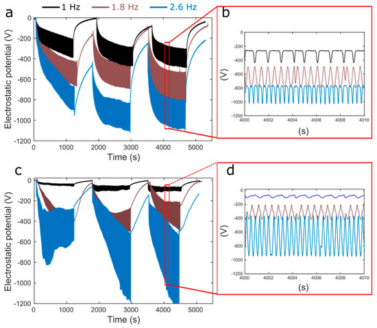 Potential variation in periodically stretched natural rubber tubing. (a,b): sample L tubing. (c,d) sample S. Plots (b,d) are zoomed views from rectangles in a and c.