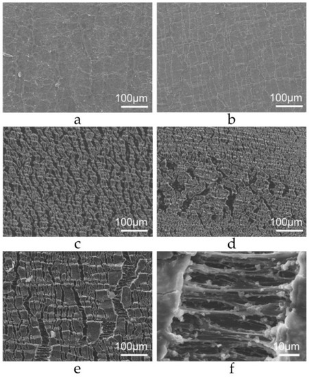 SEM micrographs obtained from different spots of the same rubber sample. In images (a,b), the rubber is not strained, while in (c–f), the rubber is elongated to twice its original length.