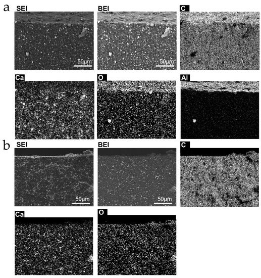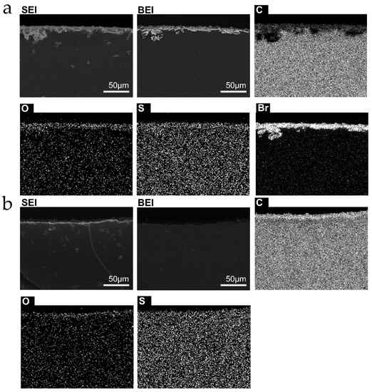 Micrographs and elemental distribution maps of cut surfaces normal to the tubing length. (a) outer surface; (b) inner surface from sample L. Sample S. The scale bars in the SEI and BEI micrographs apply to the other images from the same area.