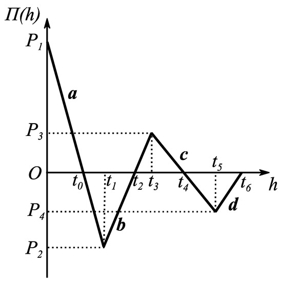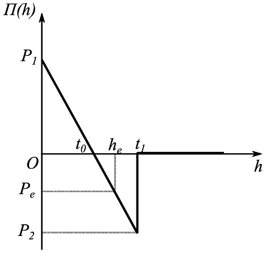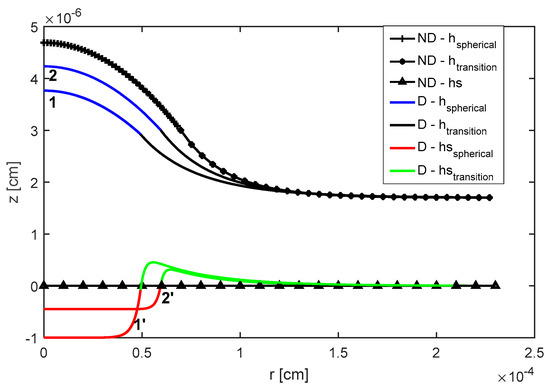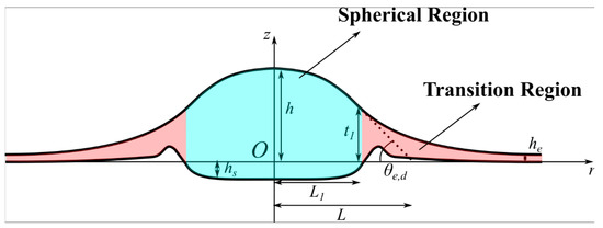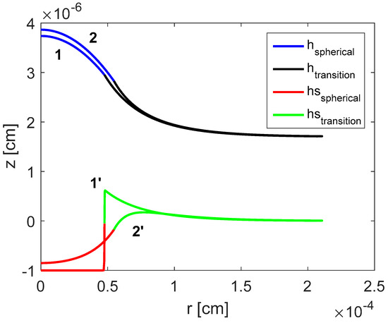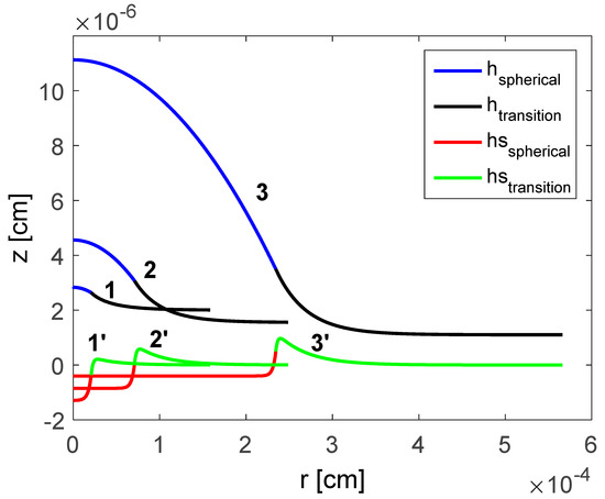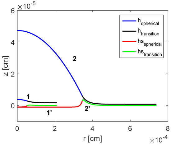 where and are defined in Figure 2, is the height of the droplet where influence of surface forces start, and is the slope of the linear disjoining/conjoining pressure isotherm. The subsequent radial length from the origin to the point is (see Figure 1). The selected linear dependency of disjoining/conjoining pressure isotherm on according to Equation (10) still portrays the essential properties mentioned in Section 2 (for details, see [18]).