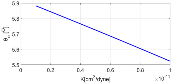 Solution of Equations (13) and (14) using the parameters of the disjoining/conjoining pressure isotherm mentioned in Table 1 is obtained in low slope approximation as above. Dependency of apparent equilibrium contact angle, , is plotted against elasticity coefficient, , in Figure 7.
