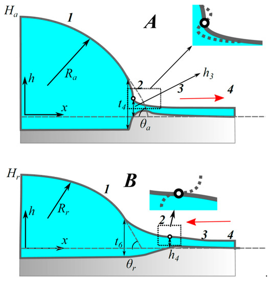 Droplet on a deformable substrate: just before advancing (A); and just before receding (B) begins (1, quasi-equilibrium part of the droplet; 2, inflection points; 3, flow zone; 4, equilibrium thin liquid film in front). Reproduced with permission from [20]. Copyright © 2018 Elsevier B.V.