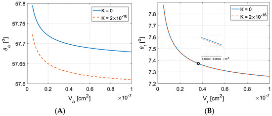Effect of variation of advancing droplet volume on advancing contact has been investigated (see Figure 11A). As droplet volume increases, the advancing contact angle reduces. Advancing contact angle on a deformable substrate is always less than on a non-deformable substrate [20,40]. Figure 11B shows the effect of variation of volume on receding contact angle. As the volume of the droplet increases, the receding contact angle reduces. Elasticity of the deformable substrate causes a decrease in receding contact angle in comparison with solid substrate, but the amount of decrease is very small, as depicted from the curves in Figure 11B. Both advancing and receding contact angles decrease for a soft substrate. This behavior has been experimentally observed [44,45].