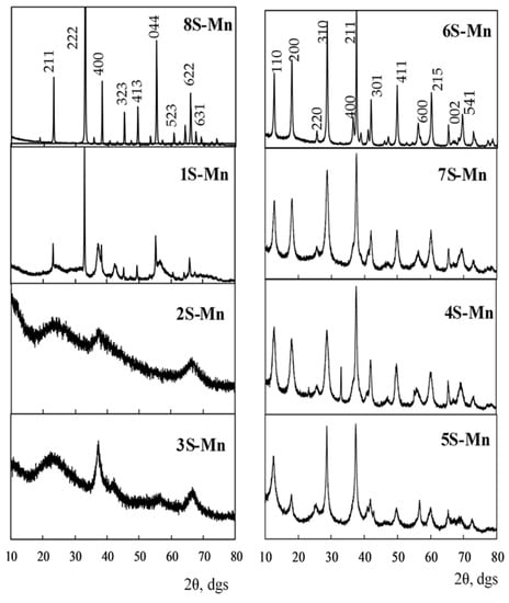 The XRD data show that both the commercial 1S-Mn sample and the 4S-Mn, 5S-Mn, 6S-Mn, 7S-Mn, and 8S-Mn samples synthesized by us are crystalline (Figure 1) and the 2S-Mn and 3S-Mn samples are semicrystalline. All XRD patterns were treated by the Rietveld method. The results of phase identification, phase contents and crystallite sizes are summarized in Table 1.