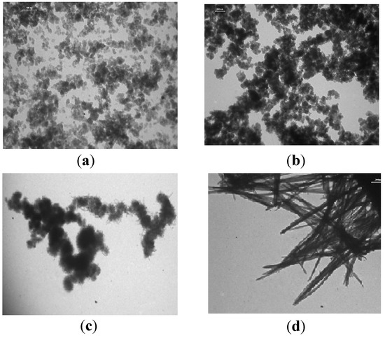 The polymorphous 1S-Mn sample (Figure 2a) consists of non-uniform particles. Particle forms for the semicrystalline ε-MnO2 phase (2S-Mn and 3S-Mn) depend on the method of their preparation. The TEM image for 2S-Mn indicates the formation of grain-like aggregates of nanoparticles with a rod-like morphology. The 3S-Mn sample consists of spherical nanoparticle aggregates with an urchin-like morphology. TEM image for nano-sized particles for cryptomelane shows that 6S-Mn (Figure 2d) has non-uniform needle-like nanorod morphology.