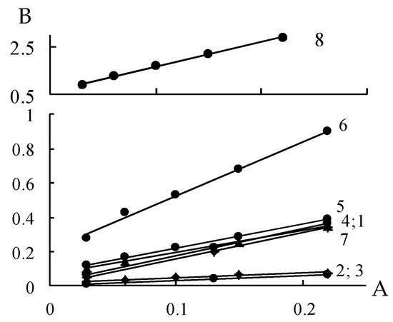 Initial linear portions of the BET adsorption isotherms for the manganese oxide samples under study A = P/Ps; B = A/a (1 − A). Indexation 1–8 corresponds to Arabic numerals in the sample designations.