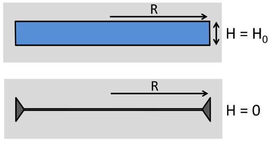 Analogously to the first step of the Volterra process, we can produce the open slit that is shown in the upper part of Figure 1. The slit with thickness and radius R is created by removing all molecules of the disk-shaped region. Then, the slit is filled with water at humidity . The contribution to the solvation force (Equation (1)) is zero for because at saturation pressure (), adhesion appears only in the borderline case (touching surfaces), as we only consider the simplest macroscopic description in this section (a force with a finite range will be considered in Section 2.2). Hence, (Equation (2)) defines the force (per unit area) between separated walls. As , the water-filled cavity retains its thickness , and there are no deformations of the solid skeleton caused by slit compression. For this state (), the elastic free energy should be equal to zero, and the water-filled slit is in mechanical equilibrium (). If humidity m is reduced, the tension compresses the slit. Assuming a Hookean behavior, the elastic free energy (divided by the area ) for the deformed solid is expected to be a quadratic function of the slit wall displacement . The ansatz:
