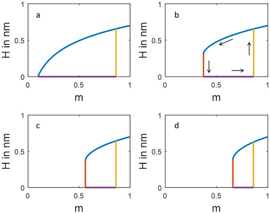 It should be noted, however, that some publications report on the appearance of jumps along the desorption branch in semi-log plots of the basal spacing versus humidity [15,22]. The macroscopic model that uses the discontinuous adhesion potential (Equation (6)) is not capable of describing a discontinuity of the basal spacing for the desorption branch. In this paper, a more realistic adhesion potential that has a finite interaction range is used. We want to check if this extension is capable of describing a discontinuous dependence of H on m.