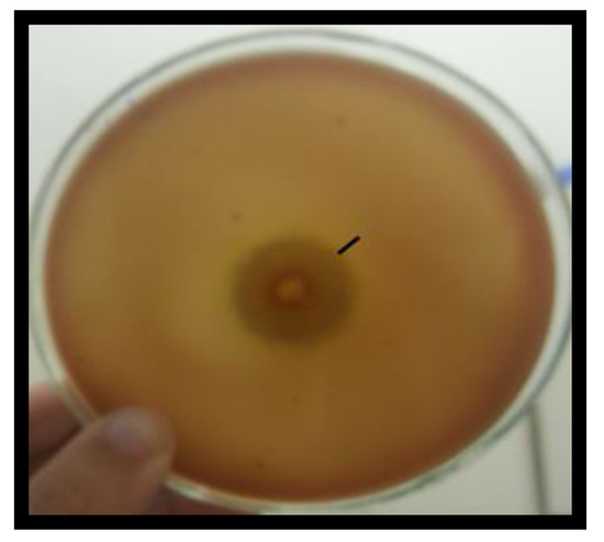 Blood agar method: Halo produced by Cunninghamella echinulata in the culture medium of blood agar, incubated at 37 °C for 48 h.