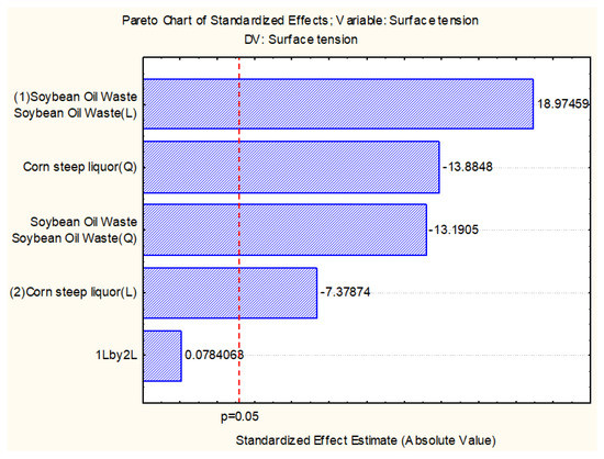 The analysis of the Pareto Diagram (Figure 2) suggests that under the conditions being evaluated, concentrations of soybean oil post-frying and corn steep liquor significantly facilitated the reduction of the surface tension. It was also observed that the interaction effect between corn steep liquor and soybean oil post-frying showed no statistically significant effect in reducing the surface tension.