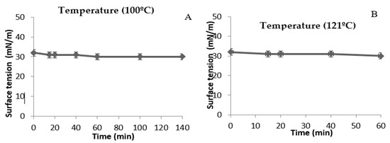 Influence of temperatures of 100 °C (A) and 121 °C (B) on the surface tension of the metabolic cell-free produced by Cunninghamella echinulata in the culture medium: Corn steep liquor (8.82%) added to post-frying soybean oil (2%).