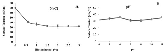 The surface tension of the cell-free broth containing the biosurfactant showed stability independent of the concentration of added salt and the pH (Figure 4A,B), respectively.